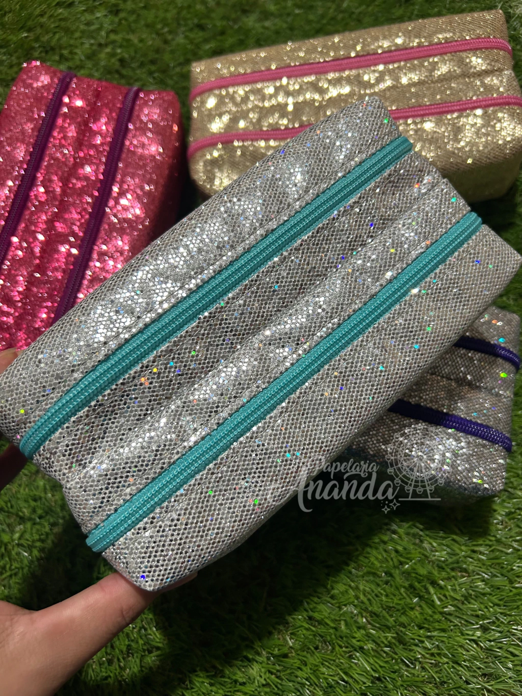 Conheça o Estojo Glitter com 2 Zíperes - Favorito! Perfeito para quem ama brilhar, mas não quer perder nada! ✨